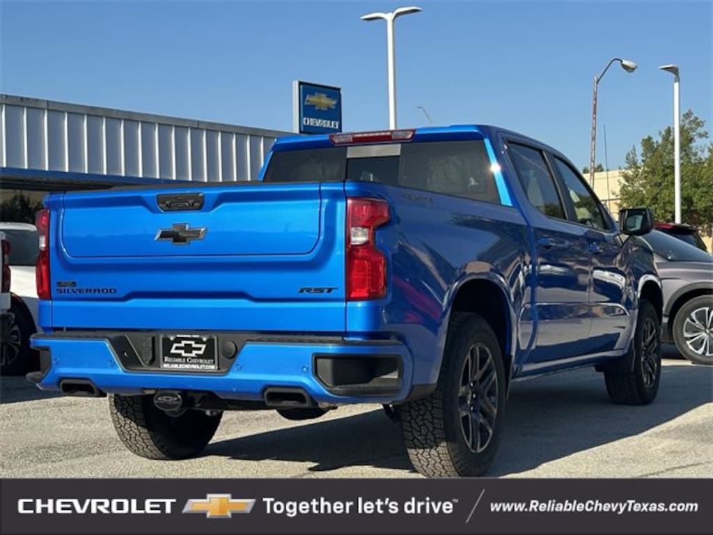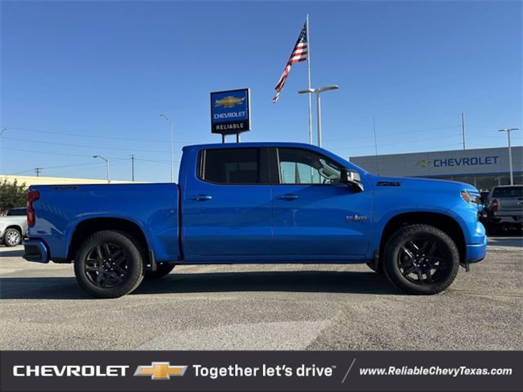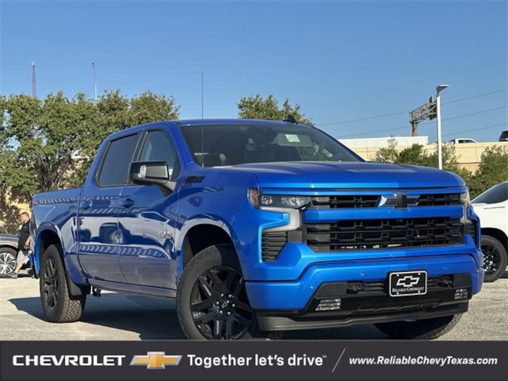 Riptide Blue 2026 Chevrolet Silverado 1500 RST Factory MSRP: $66,580You'll appreciate its safety and convenience features! Chevrolet prioritized practicality, efficiency, and style by including: 4WD EcoTec3 5.3L V8 10-Speed Automatic 10-Speed Automatic, 4WD, Black Leather, 10-Way Power Driver Seat w/Lumbar, 12.3 Multicolor Reconfigurable Digital Display, 120-Volt Bed Mounted Power Outlet, 120-Volt Interior Power Outlet, 2 USB Data Ports, 4-Wheel Disc Brakes, 6 Speakers, 6-Speaker Audio System, ABS brakes, Air Conditioning, All-Star Edition, AM/FM radio: SiriusXM with 360L, Apple CarPlay/Android Auto, Auto High-beam Headlights, Auto-Locking Rear Differential, Automatic temperature control, Bluetooth® For Phone, Brake assist, Chevytec Spray-On Black Bedliner, Color-Keyed Carpeting Floor Covering, Convenience Package, Convenience Package II, Dark Appearance Package, Deep-Tinted Glass, Delay-off headlights, Dual Exhaust w/Polished Outlets, Dual front impact airbags, Dual front side impact airbags, Dual Rear USB Ports (Charge Only), Dual-Zone Automatic Climate Control, Electric Rear-Window Defogger, Electronic Cruise Control, Electronic Stability Control, Emergency communication system: OnStar, EZ Lift Power Lock & Release Tailgate, Front anti-roll bar, Front dual zone A/C, Front fog lights, Front Frame-Mounted Black Recovery Hooks, Front LED Fog Lamps, Front Rubberized Vinyl Floor Mats, Front wheel independent suspension, Fully automatic headlights, HD Rear Vision Camera, HD Surround Vision, Heated Driver & Front Outboard Passenger Seats, Heated Power-Adjustable Outside Mirrors, Heated Steering Wheel, Heavy-Duty Air Filter, High Capacity Suspension Package, High Gloss Black Mirror Caps, Hill Descent Control, Hitch Guidance, Hitch Guidance w/Hitch View, In-Vehicle Trailering System App, Inside Rear-View Mirror w/Tilt, Integrated Trailer Brake Controller, Keyless Open & Start, Leather Package, Leather-Appointed Front Seat Trim, LED Cargo Area Lighting, Low tire pressure warning, Manual Tilt/Telescoping Steering Column, Occupant sensing airbag, Off-Road Suspension, OnStar Services Capable, Overhead airbag, Panic alarm, Perimeter Lighting, Power driver seat, Power Front Windows w/Driver Express Up/Down, Power Front Windows w/Passenger Express Down, Power Rear Windows w/Express Down, Power Sliding Rear Window w/Rear Defogger, Power steering, Power windows, Preferred Equipment Group 1SP, Premium audio system: Chevrolet Infotainment 3 Premium, Premium Bose 7-Speaker Sound System, Protection Package, Radio data system, Radio: Chevrolet Infotainment 3 Premium System, Rear 60/40 Folding Bench Seat (Folds Up), Rear Cross Traffic Braking, Rear Pedestrian Alert, Rear Rubberized-Vinyl Floor Mats, Rear Wheelhouse Liners, Rear window defroster, Remote keyless entry, Remote Vehicle Starter System, Safety Package, Security system, SiriusXM w/360L Trial Subscription, Speed control, Speed-sensing steering, Standard Suspension Package, Standard Tailgate, Steering Wheel Audio Controls, Steering wheel mounted audio controls, Teen Driver, Texas Edition Badging, Texas Edition Plus, Theft Deterrent System (Unauthorized Entry), Tire Pressure Monitoring System, Traction control, Trailer Camera Provisions, Trailer Side Blind Zone Alert, Trailering Package, Ultrasonic Front & Rear Park Assist, Universal Home Remote, Up-Level Rear Seat w/Storage Package, Wheels: 20 x 9 High Gloss Black Painted Alum, Wheels: 20 x 9 Painted Aluminum, Wi-Fi Hot Spot Capable, Wrapped Steering Wheel, Z71 Off-Road Package.We pride ourselves on providing excellent customer service. Please don't hesitate to give us a call. Reliable Chevrolet conveniently located at 800 N. Central Expressway & Arapaho in Richardson, Texas.